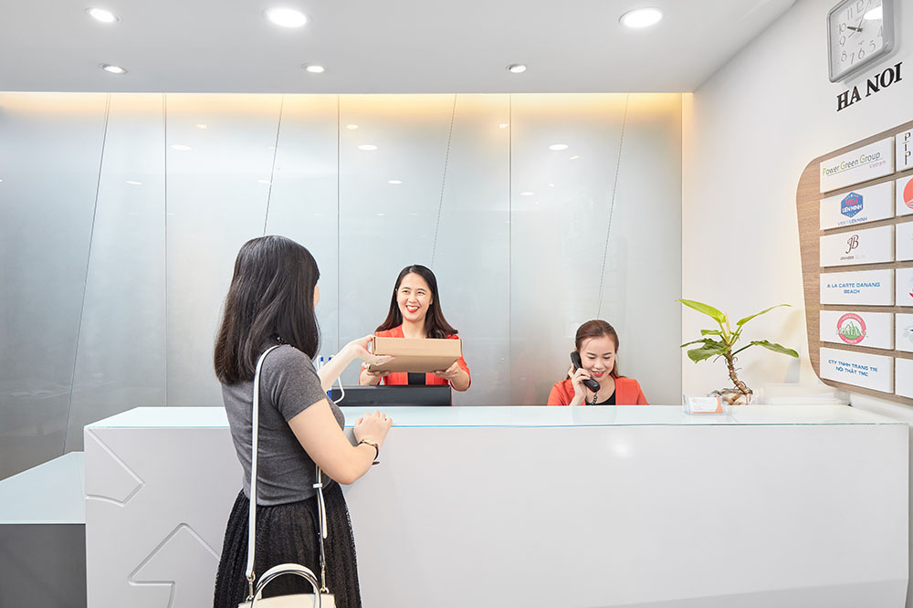 Hình ảnh lễ tân chuyên nghiệp tiếp đón khách khi sử dụng dịch vụ văn phòng tại G Office